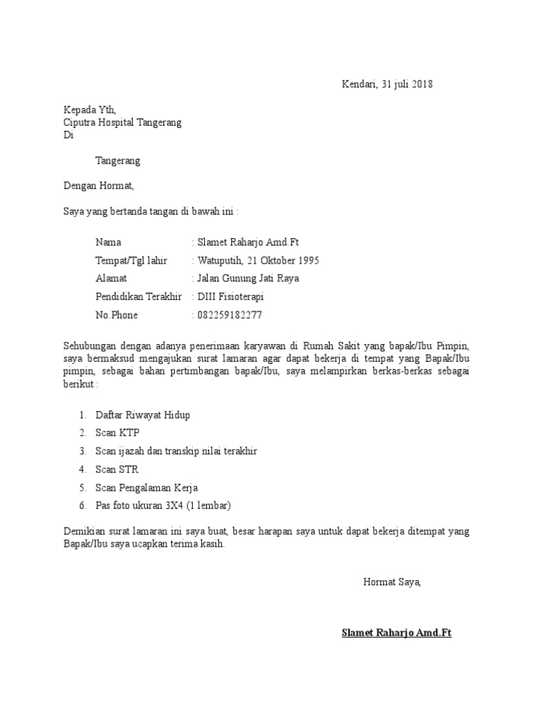 Format contoh surat lamaran kerja di rumah sakit menggunakan bahasa inggris yang baik 2019. 10+ contoh surat lamaran kerja di rumah sakit paling lengkap from contohsurat.co membuat surat lamaran pekerjaan terbaru 2021 yang baik dan benar merupakan hal yang wajib dilakukan oleh para pencari kerja. Inilah pembahasan selengkapnya mengenai contoh surat lamaran kerja di rs bhayangkara. Contoh surat lamaran kerja di rumah sakit i jakarta, 01 januari 2012 hal: 15 contoh surat lamaran kerja rumah sakit bhayangkara yang baik 2019 Tempat dan tgl lahir : Artikel contoh surat lamaran kerja security di rumah sakit yang benar.selamat datang kembali pada situs marketmedan.com yang mana kita kali ini akan membahas mengenai contoh surat lamaran kerja security pada rumah sakit. Contoh surat lamaran kerja lengkap & terbaru 2019 yang baik dan benar / eyd, umum, tulisan tangan, guru, rumah sakit, perusahaan, tulis contoh. Ketika kamu telah lulus dari jenjang pendidikan kedokteran, keperawatan, atau kebidanan pasti telah berencana untuk melamar pekerjaan di rumah sakit. Sudah sejak lama mindset yang tertanam di benak orang indonesia bahwa bekerja di rumah sakit, tentunya sebagai salah satu tenaga kesehatan, merupakan hal yang menjanjikan di bidang finansial—terlepas dari akibat pekerjaan yang cukup riskan karena berkaitan erat. Sahabat 99, surat lamaran kerja harus dipersiapkan bagi kamu yang sudah siap masuk ke dunia kerja. Contoh surat lamaran kerja di rumah sakit jadi radiografer. Bpk./ibu pimpinan rumah sakit sehat husada jakarta.